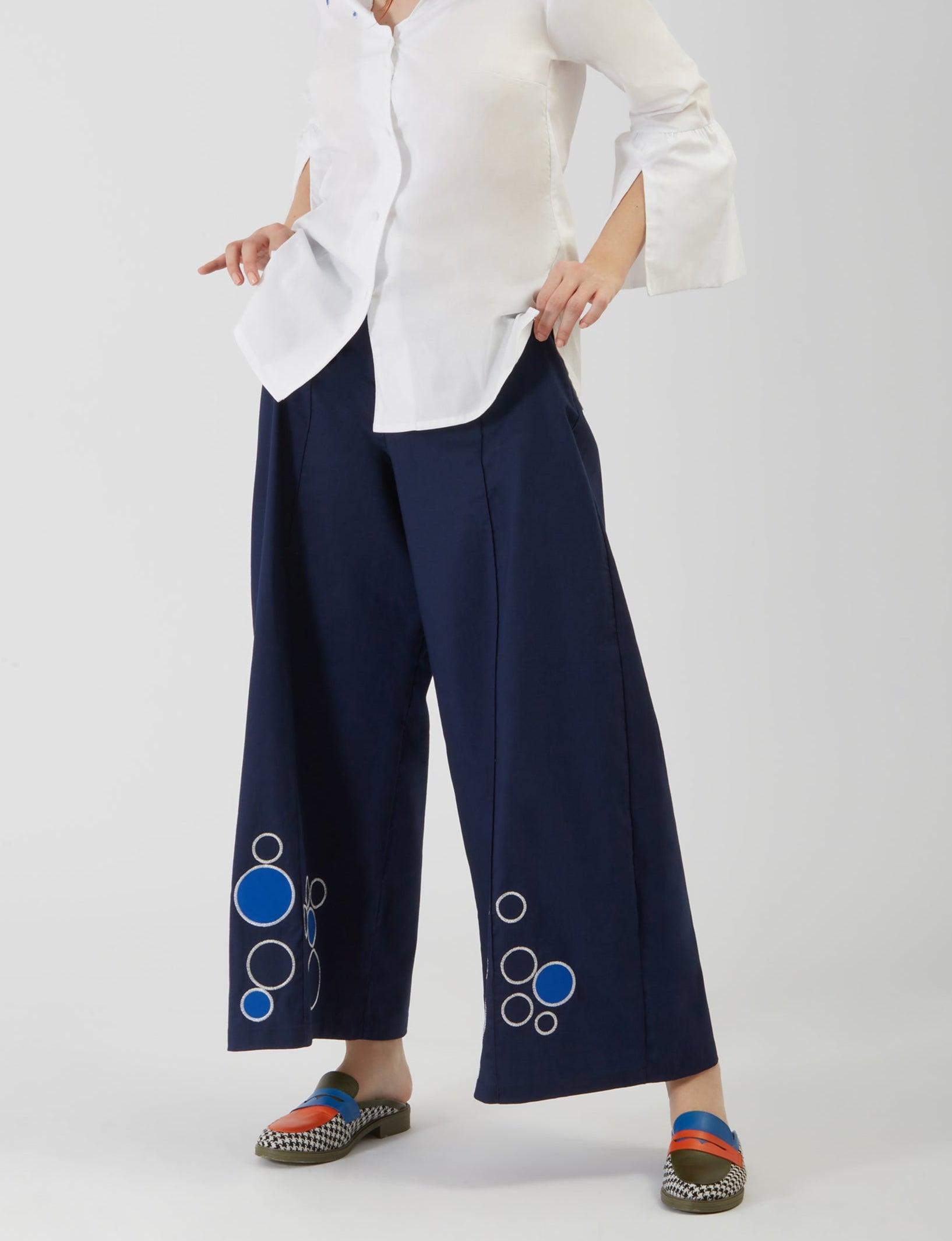 Suecos planos, con textil print gallineto en tejido de punto  y cuero. Suela de goma verde militar. Cada zapato izquierdo y derecho diferente.