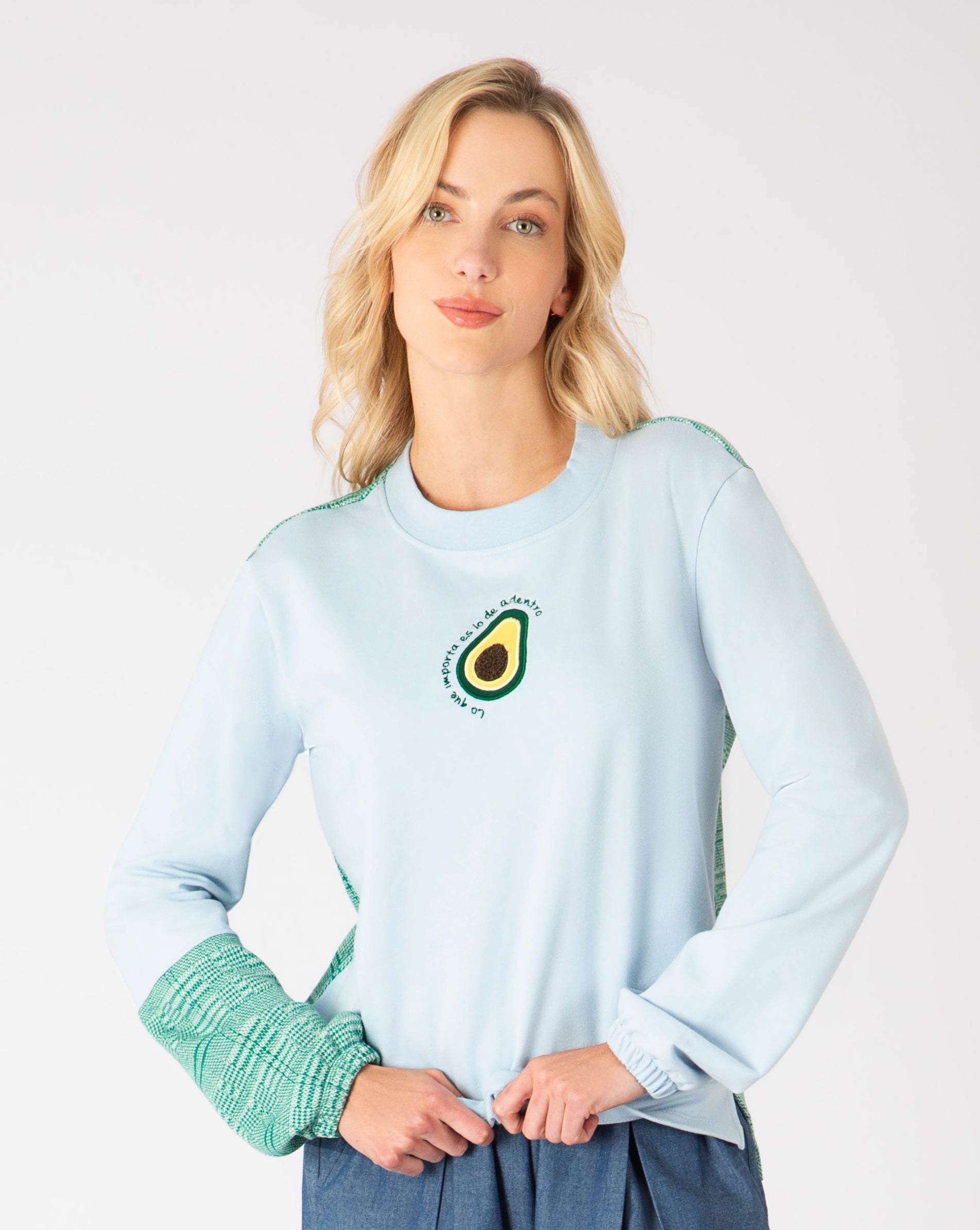En el pecho, luce un bordado de aguacate realizado con mezcla de apliques y bordado plano, donde la pepa en chenil aporta un efecto de volumen y suavidad. Todo acompañado de la divertida frase: “Lo que importa es lo de adentro”, que convierte esta prenda en un ícono de estilo con personalidad.
