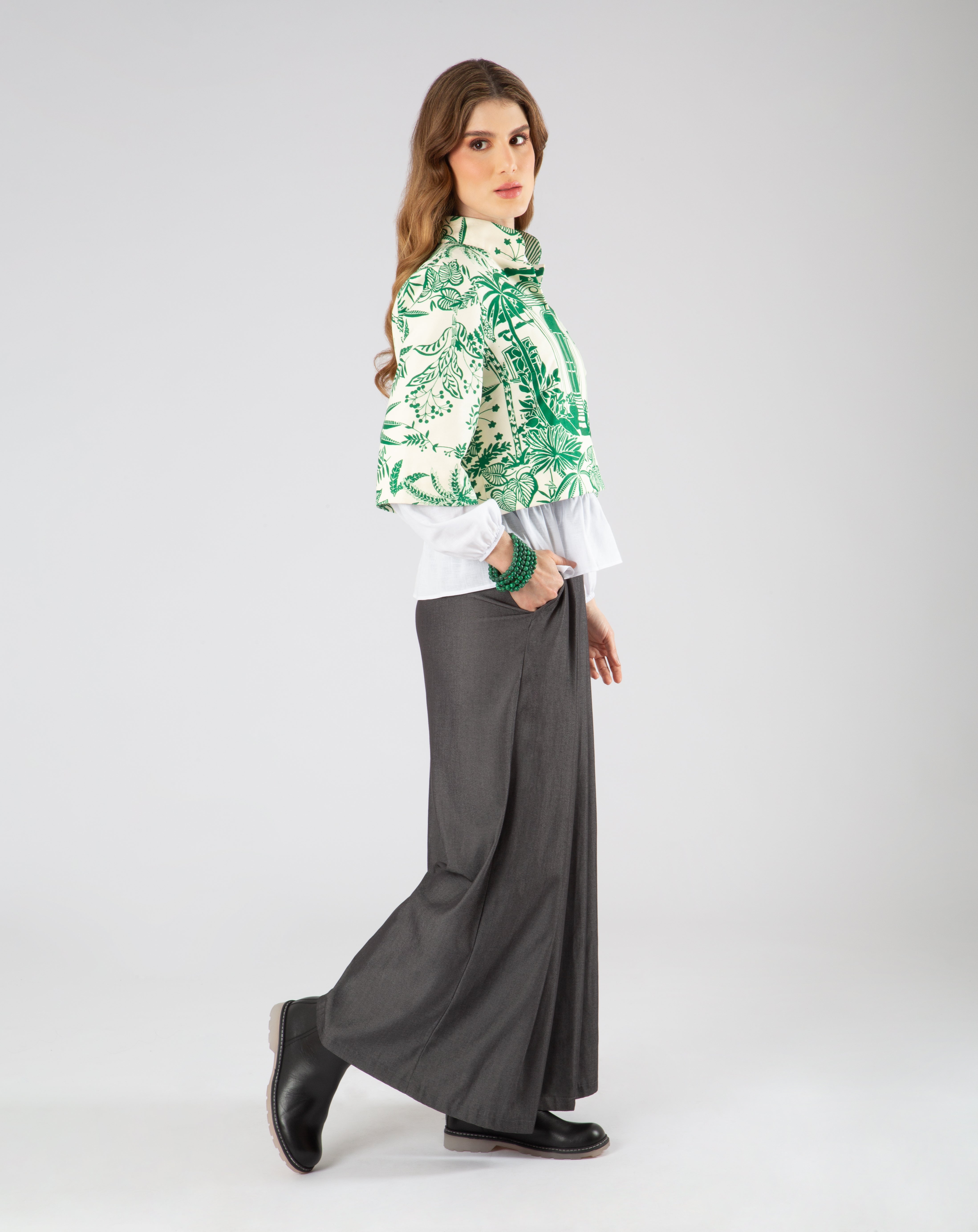 Confeccionada en popelina blanca de algodón, y su encanto radica en el bordado de hojas tropicales que emergen desde el bolsillo, como si la prenda respirara vida.