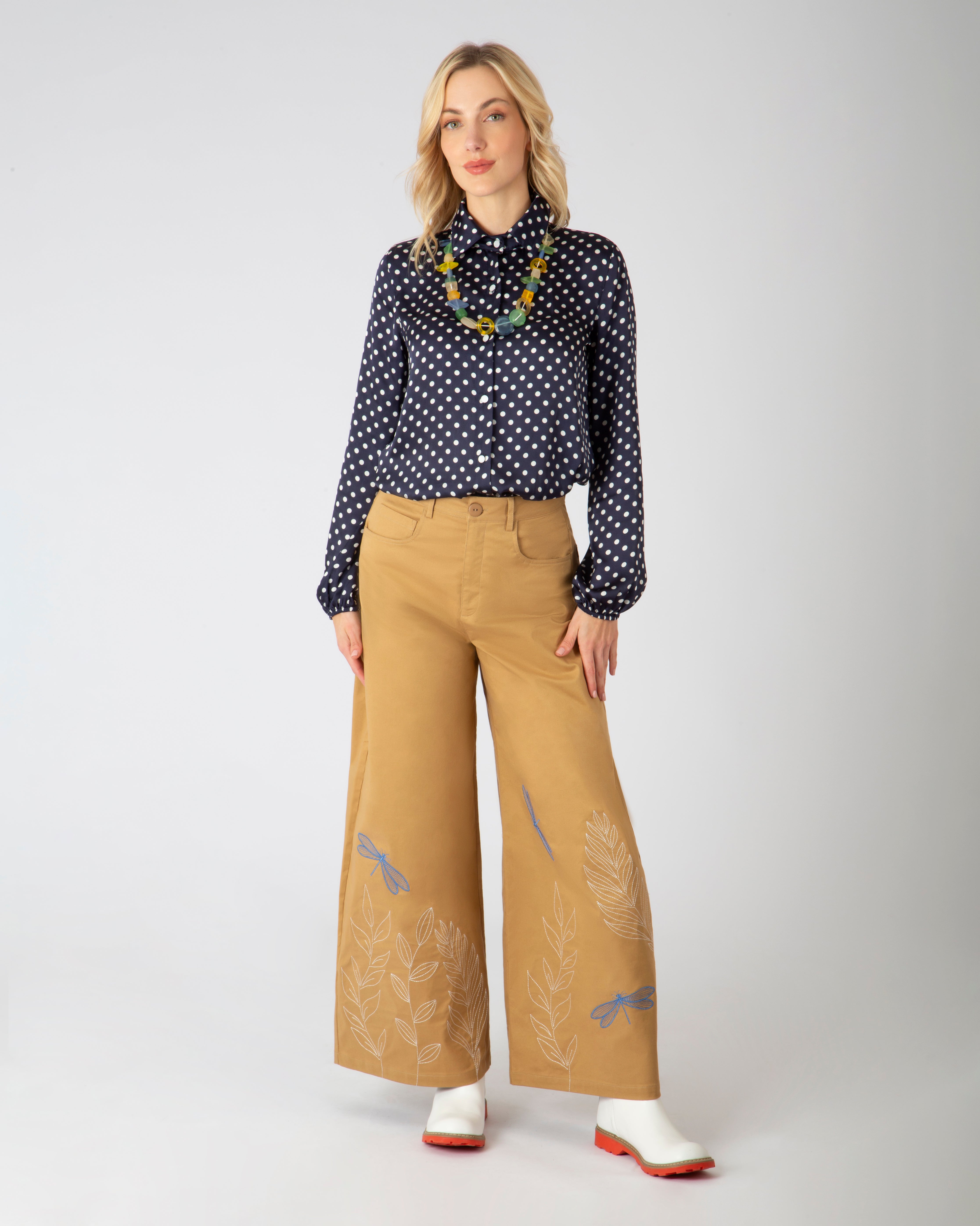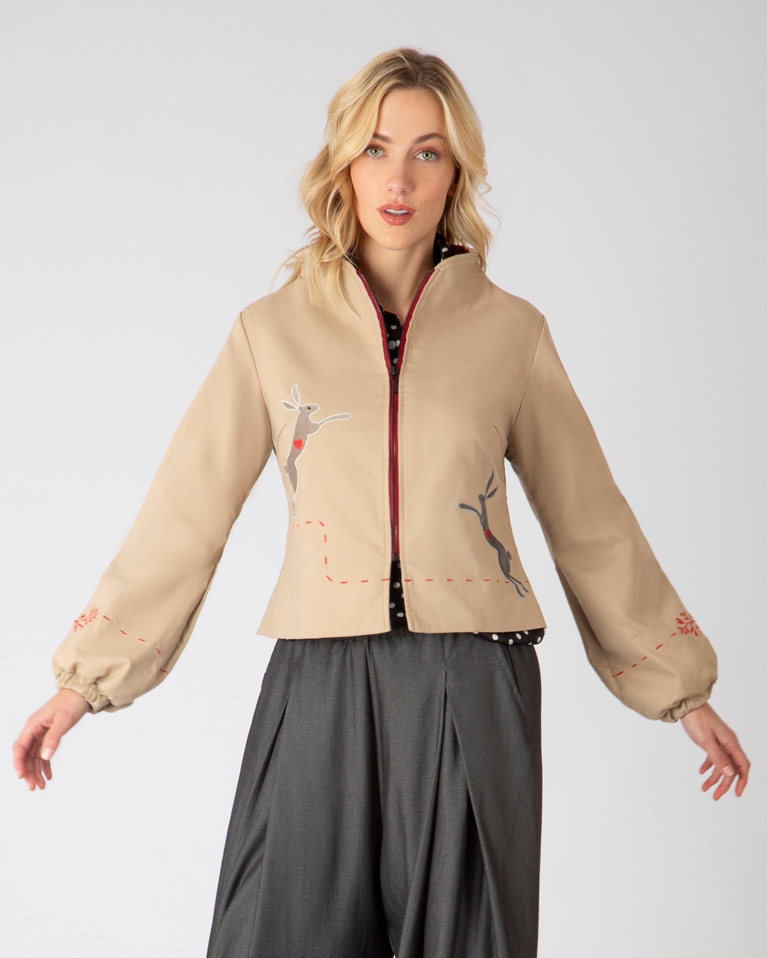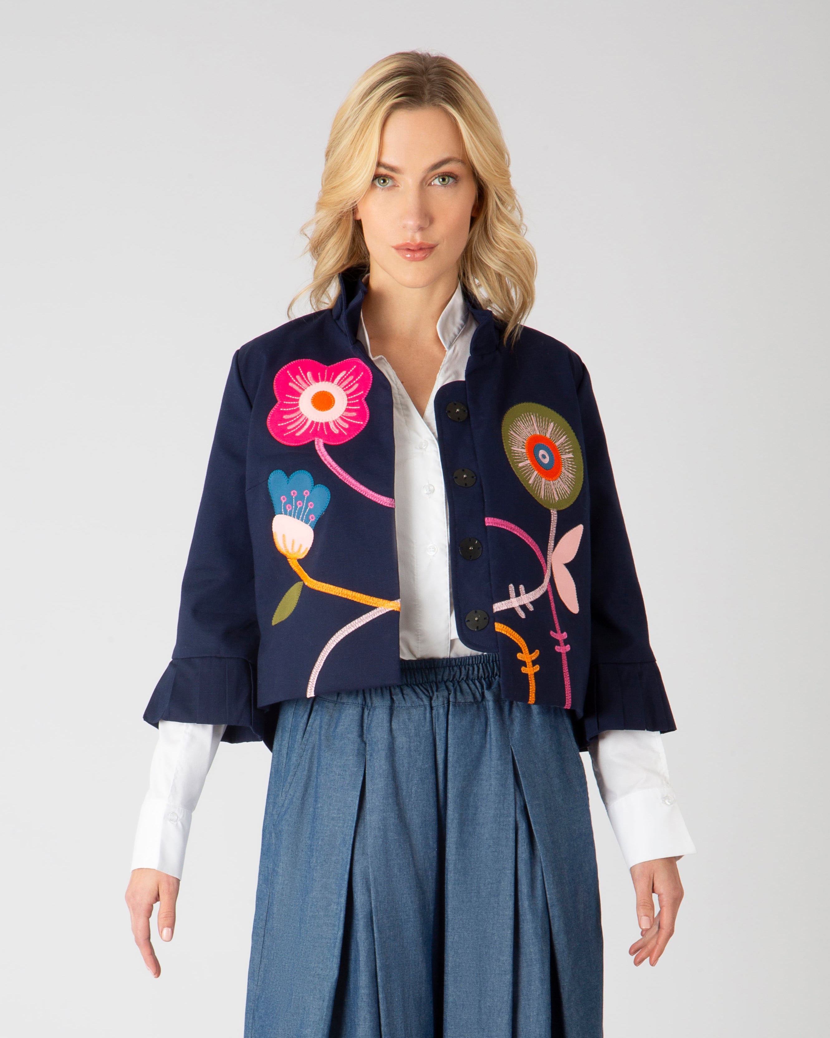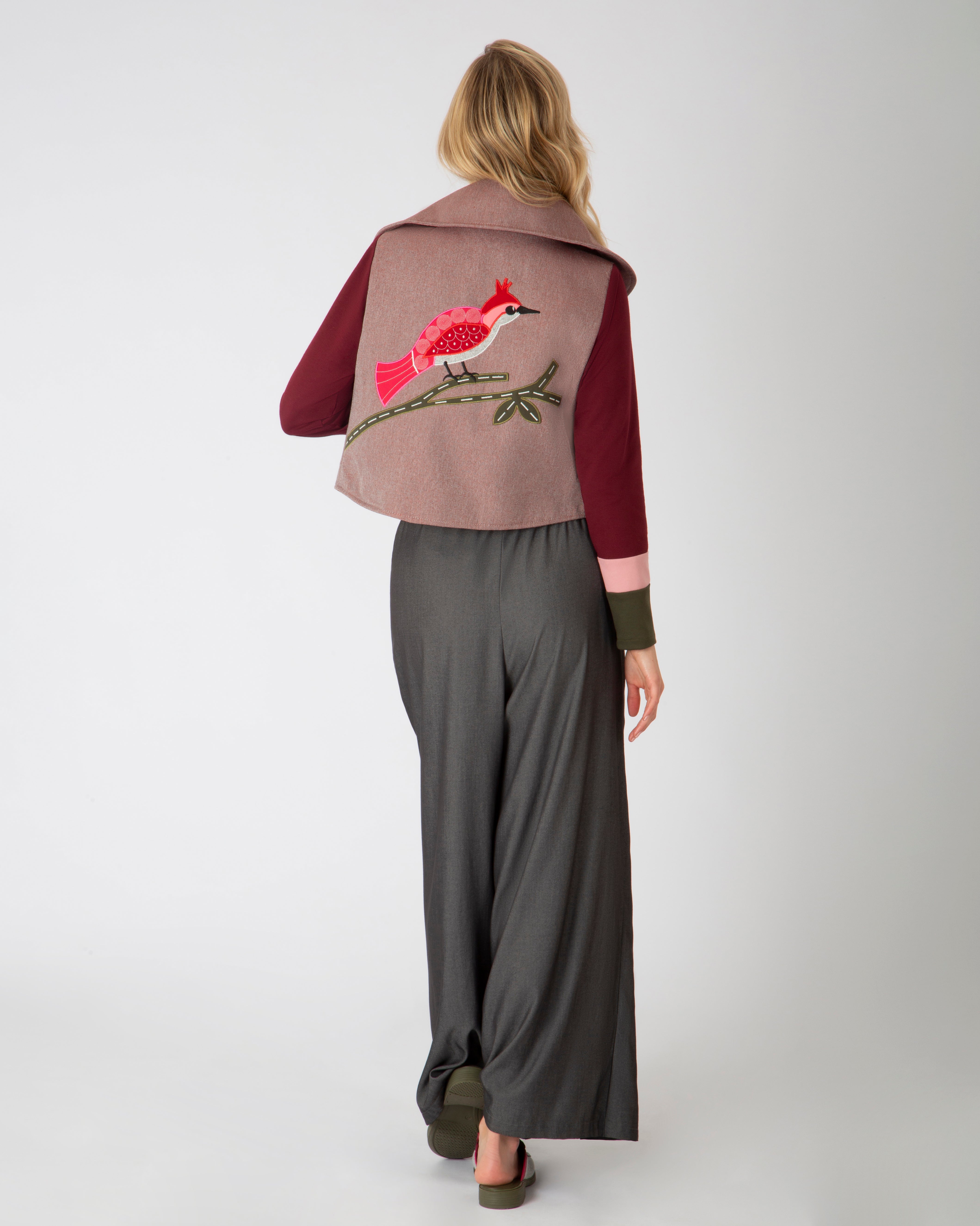 Cada prenda lleva texturas vivas: bordados con alas, antenas, pétalos y escamas. Hilos que respiran. Relieves que cuentan historias. Nada es plano, porque aquí todo tiene alma.