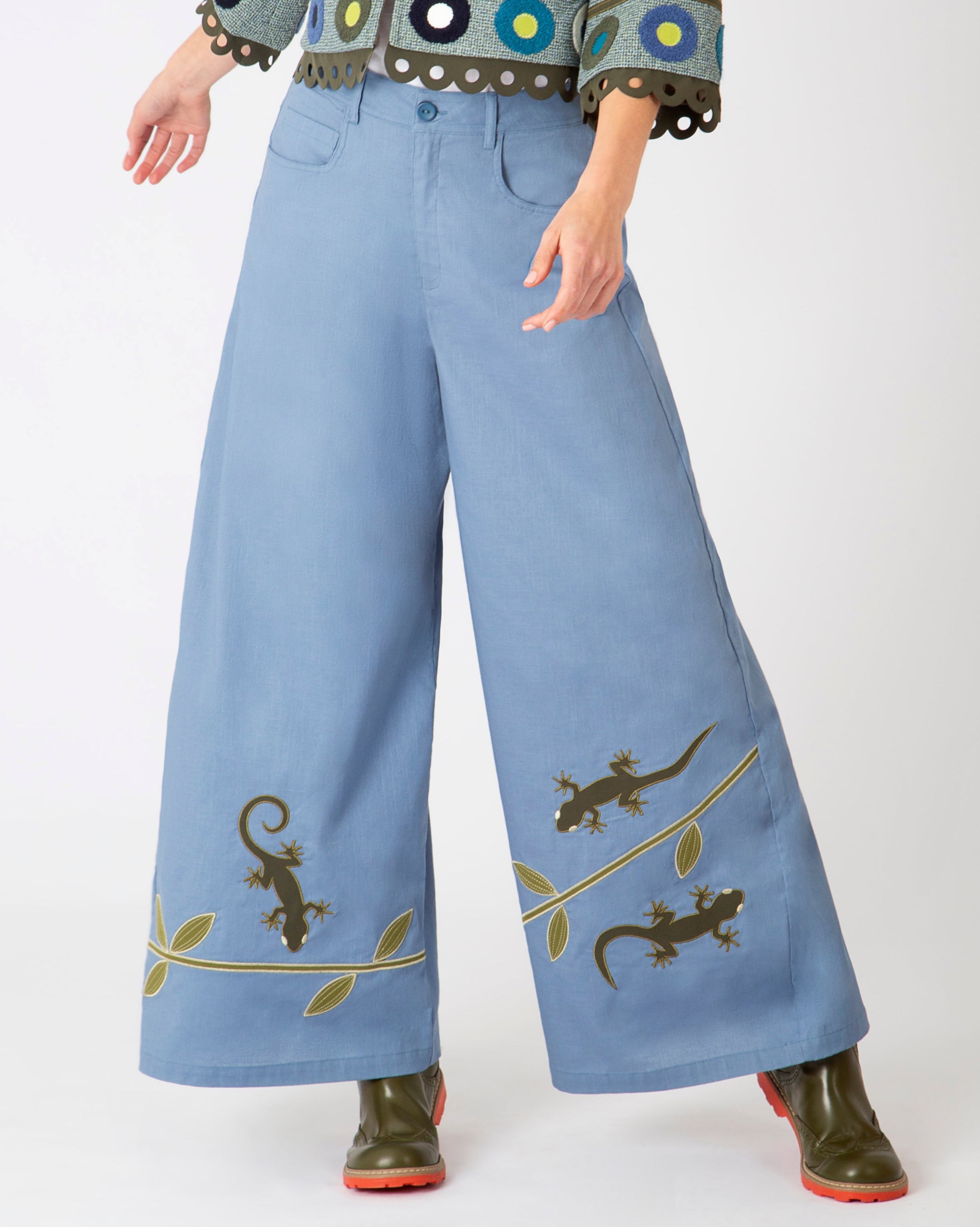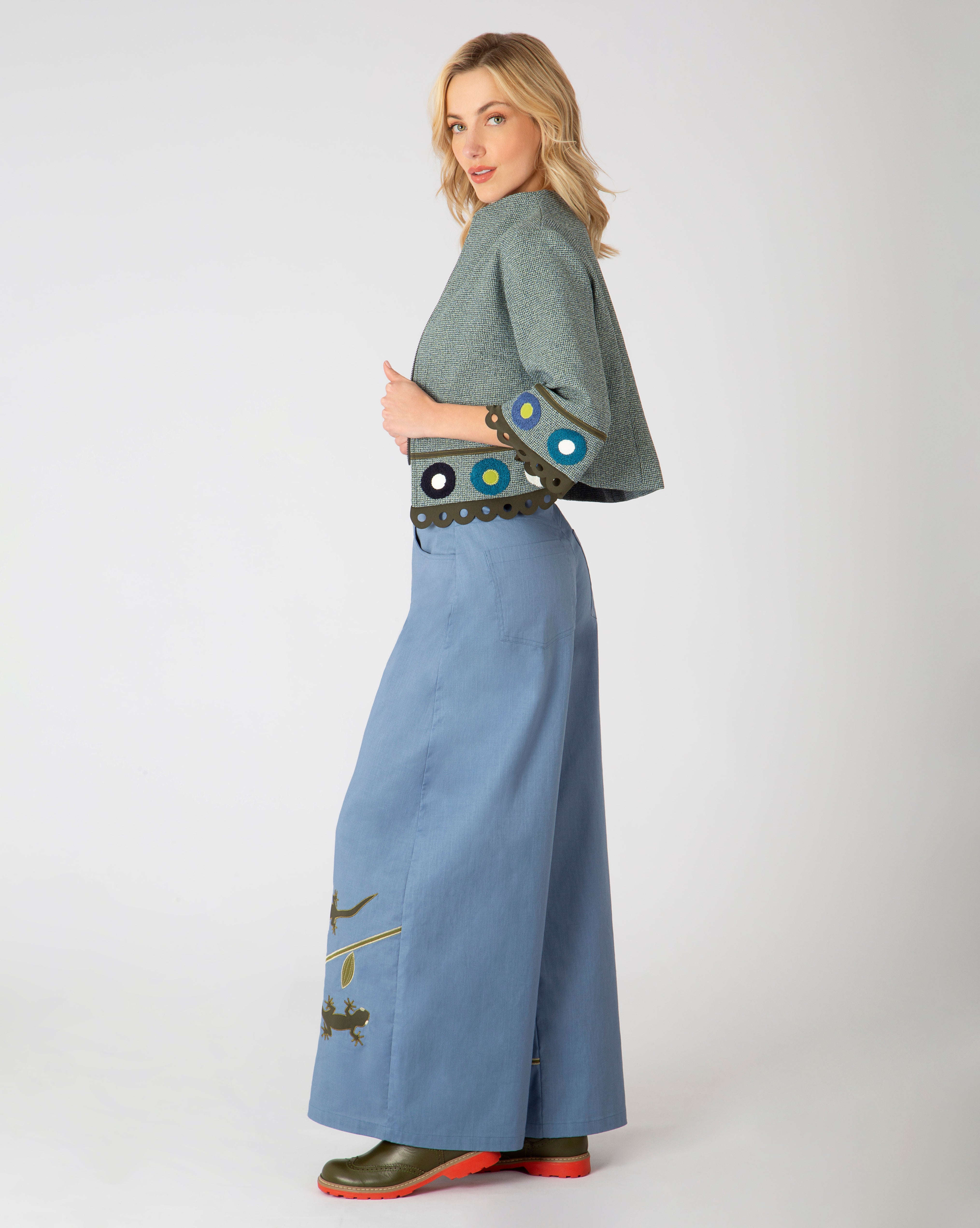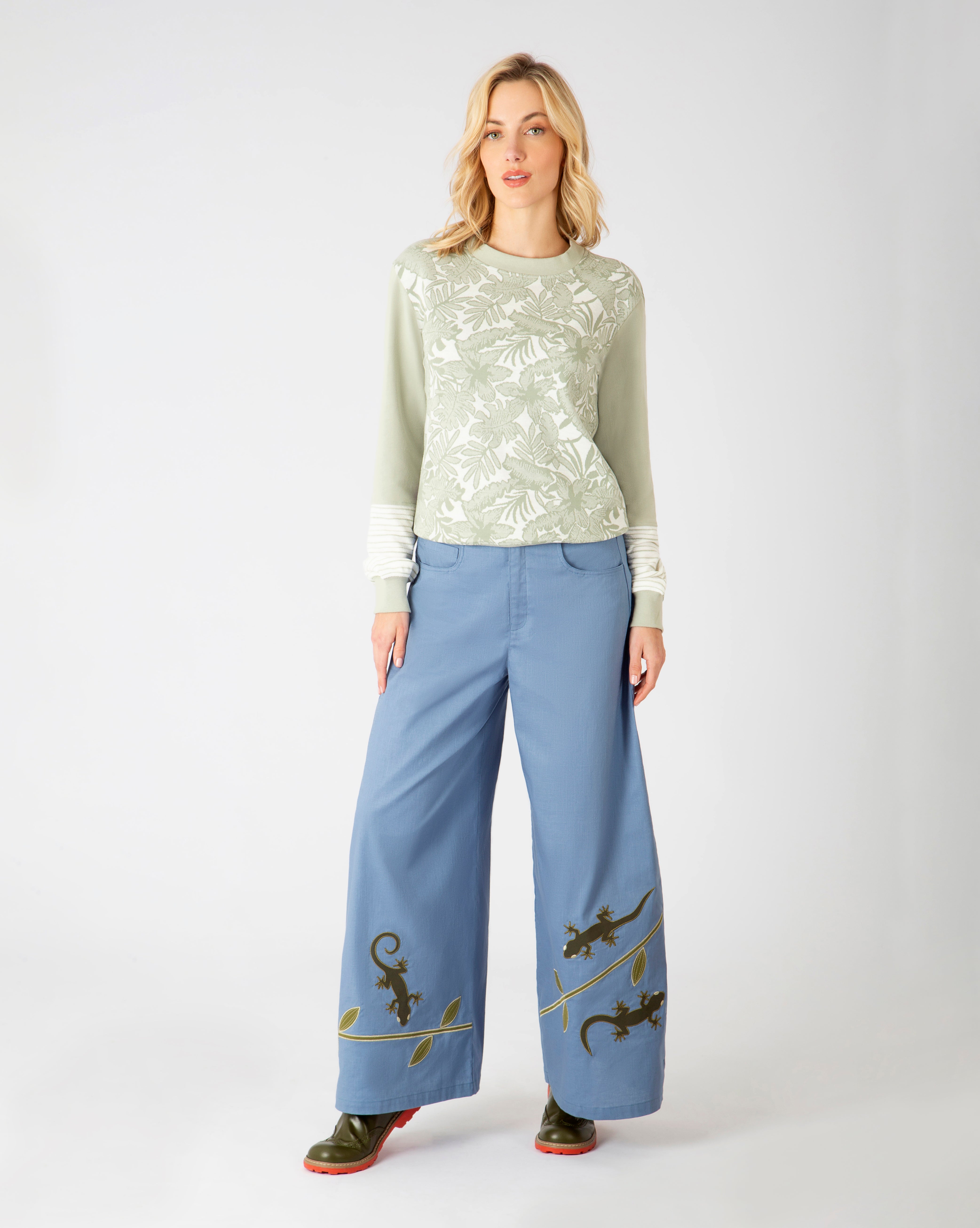 Cada prenda lleva texturas vivas: bordados con alas, antenas, pétalos y escamas. Hilos que respiran. Relieves que cuentan historias. Nada es plano, porque aquí todo tiene alma.