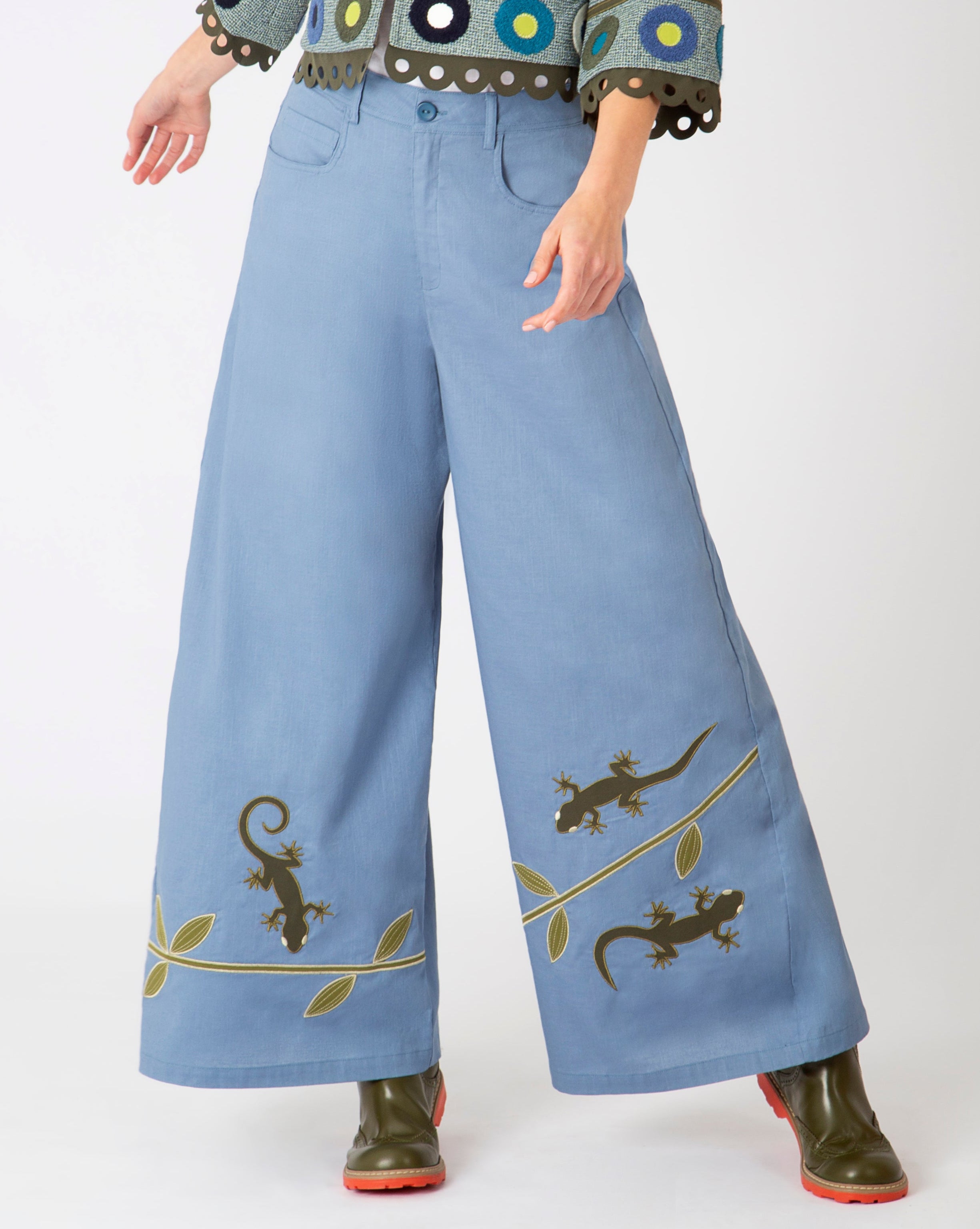 Pantalón amplio en lino viscosa de color azul grisáceo, con bordado plano y apliques de lagartijas en tonos verde militar y ramas verde olivo, que recorren ambas piernas sobre ramas estilizadas. Cintura con pretina y bolsillos funcionales adelante y atrás. Una prenda fresca, artística y cómoda, ideal para looks relajados, originales y con estilo.