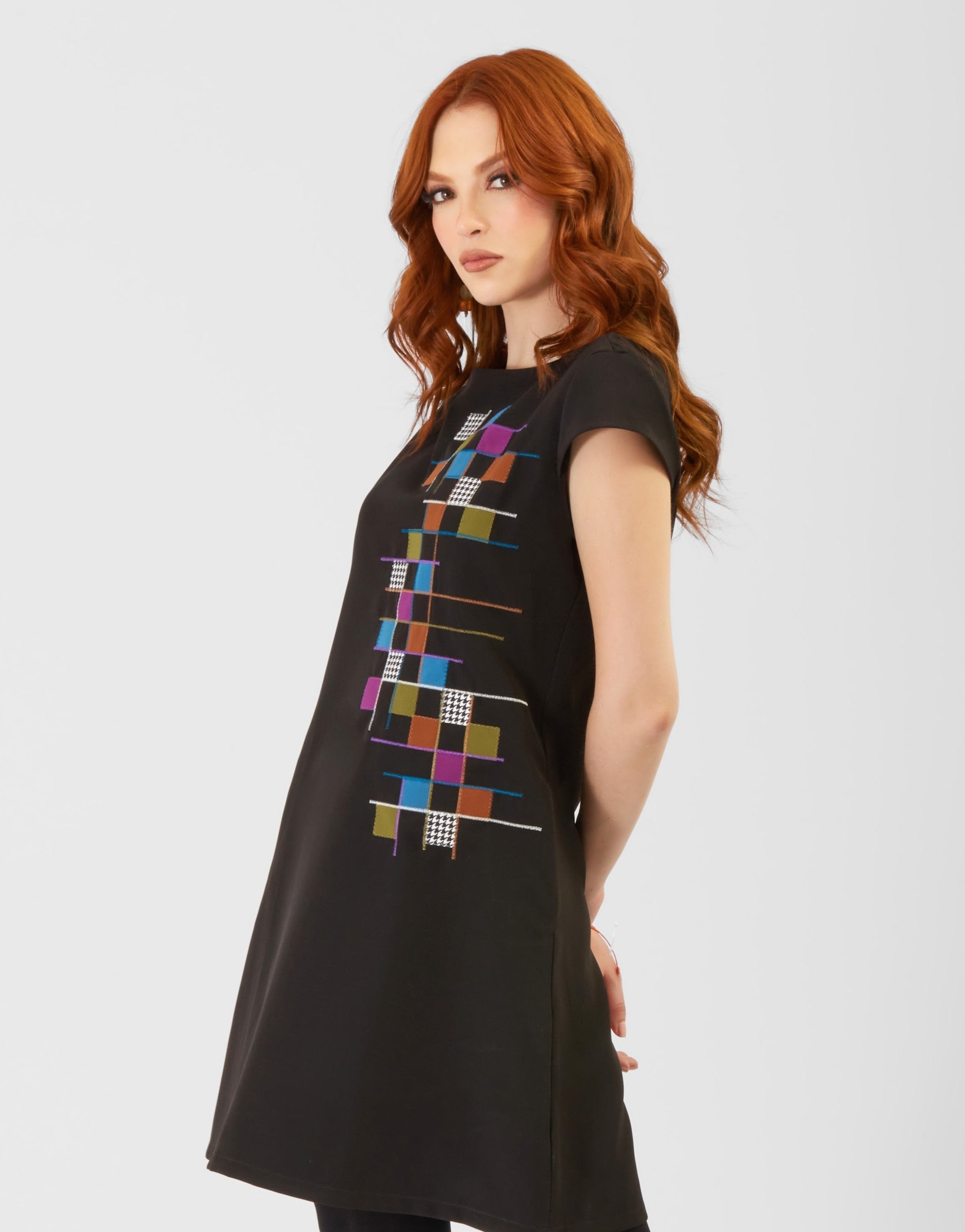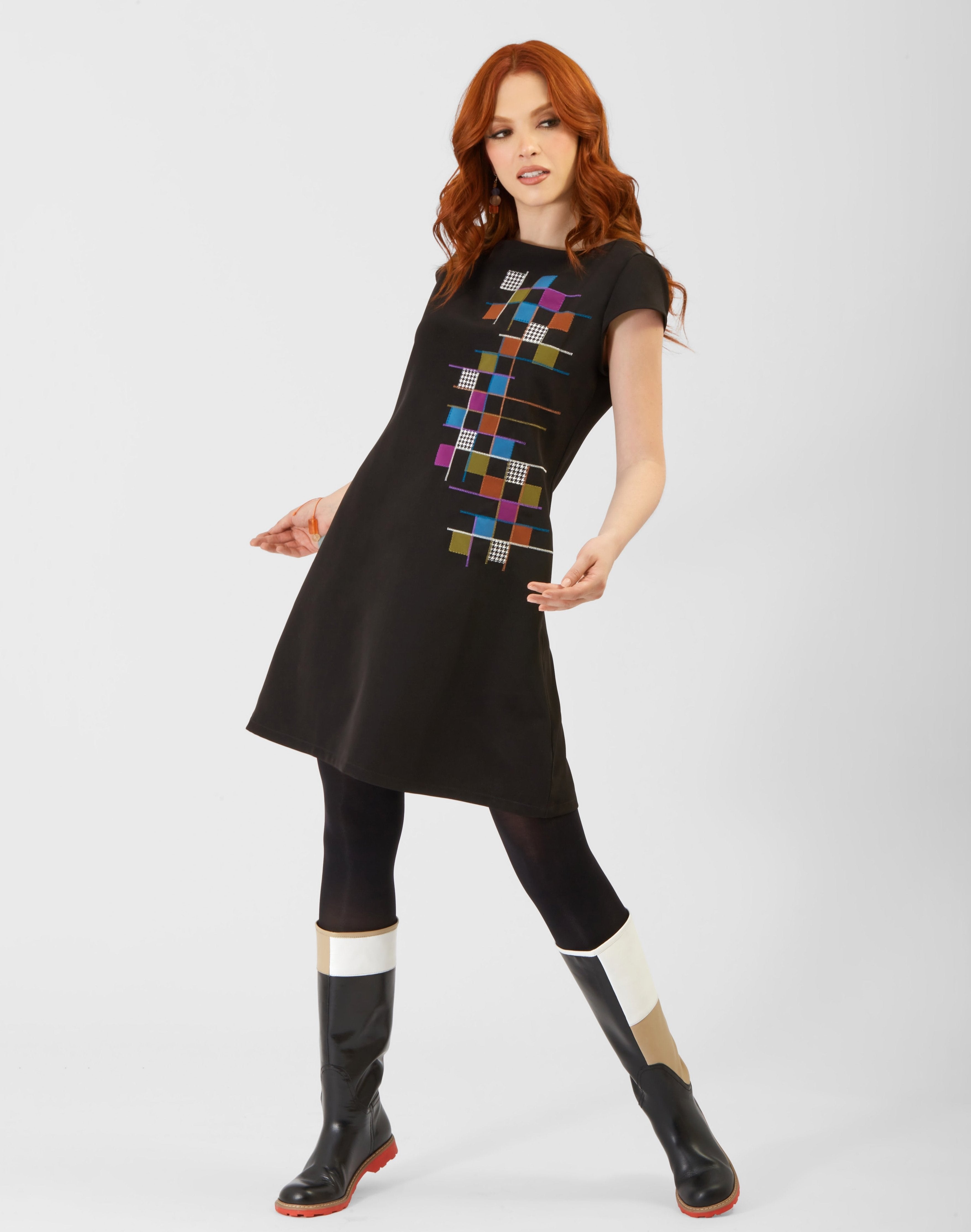 Vestido negro con cuello bandeja, con divertidos apliques y bordados con diseño de cuadrícula multicolor.