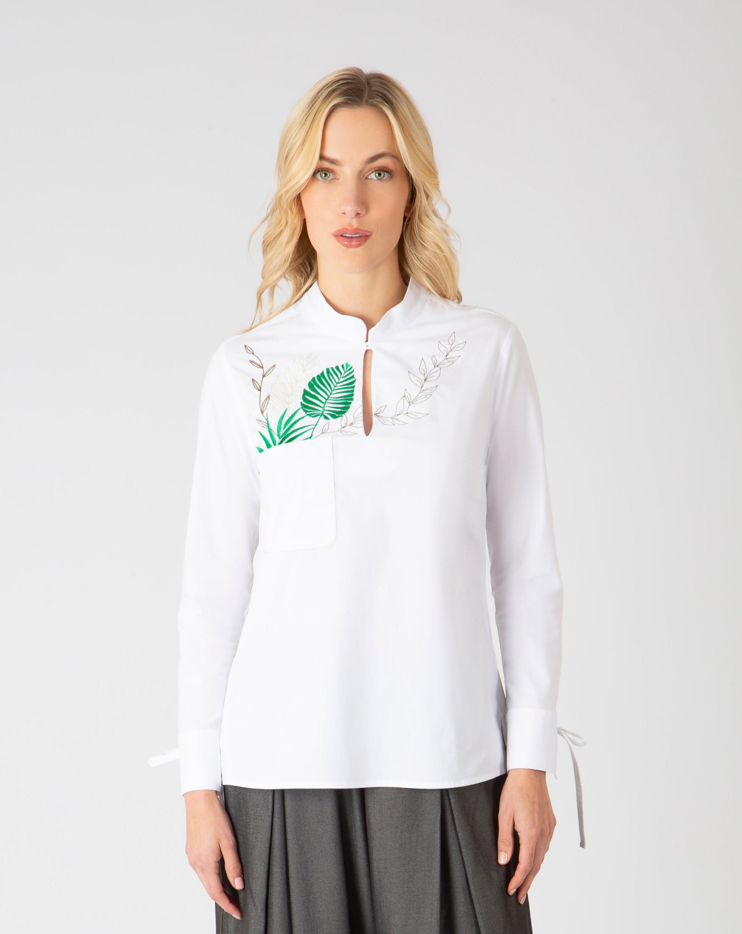 Confeccionada en popelina blanca de algodón, y su encanto radica en el bordado de hojas tropicales que emergen desde el bolsillo, como si la prenda respirara vida.